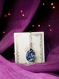 Cristallo Swarovski ( non certificato) blu con laccetto e elementi grafici in lega di zinco placcato in oro bianco. Piuccoli zirconi bianchi su gancio del ciondolo e sull’elemento grafico che percorre la goccia.